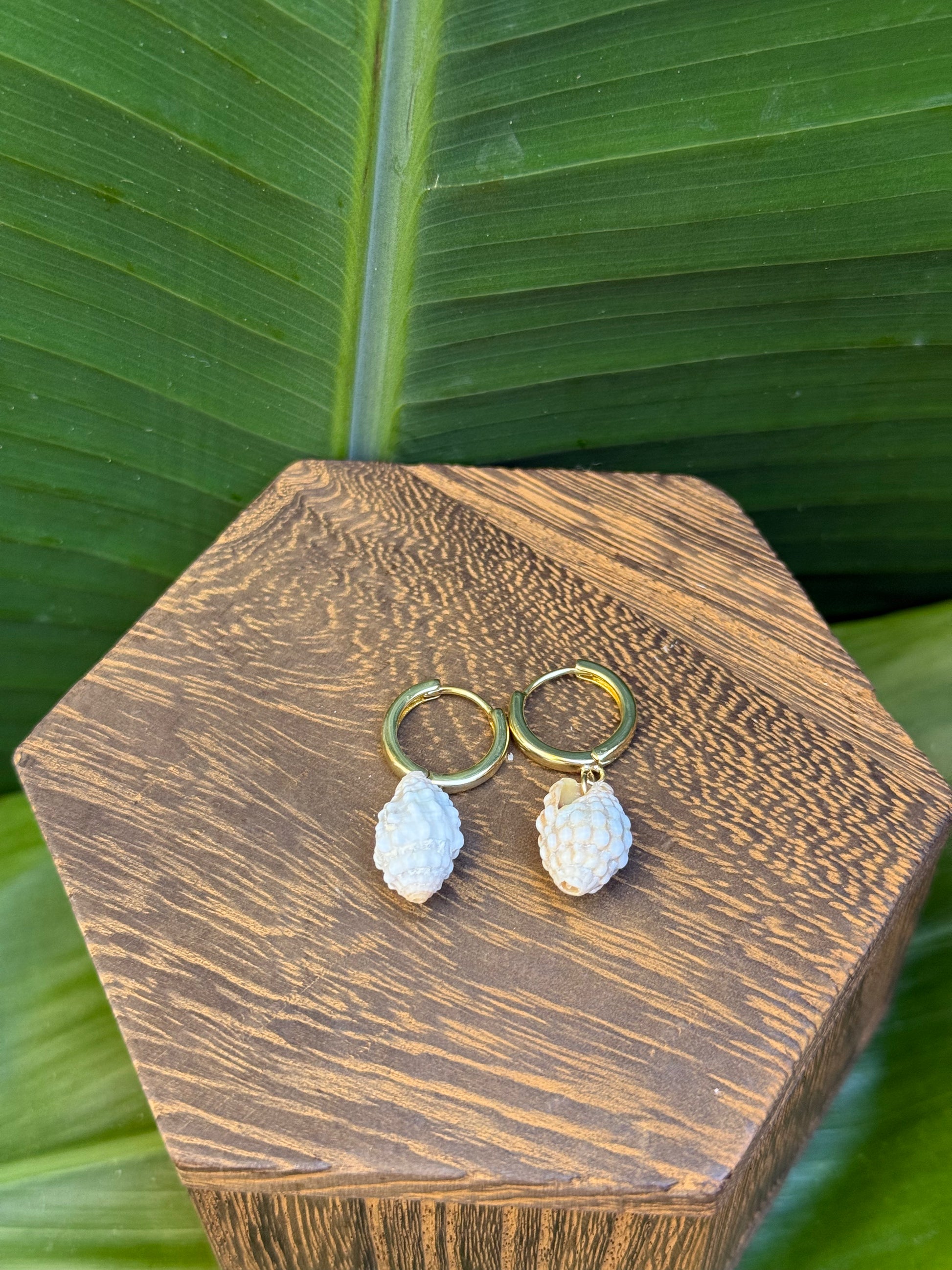 A beautiful set 14k gold-filled huggie earrings featuring two white lattice miter shells